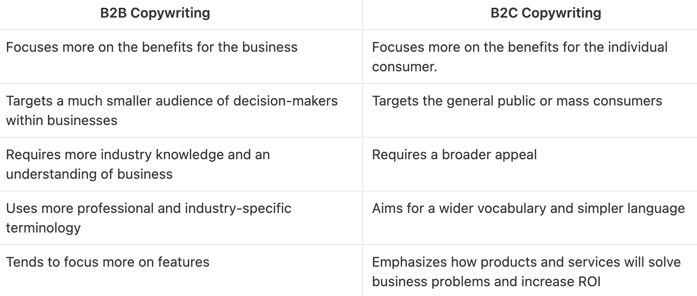 When it comes to copywriting, there are some key differences between writing for B2C (business-to-consumer) and B2B (business-to-business) audiences.