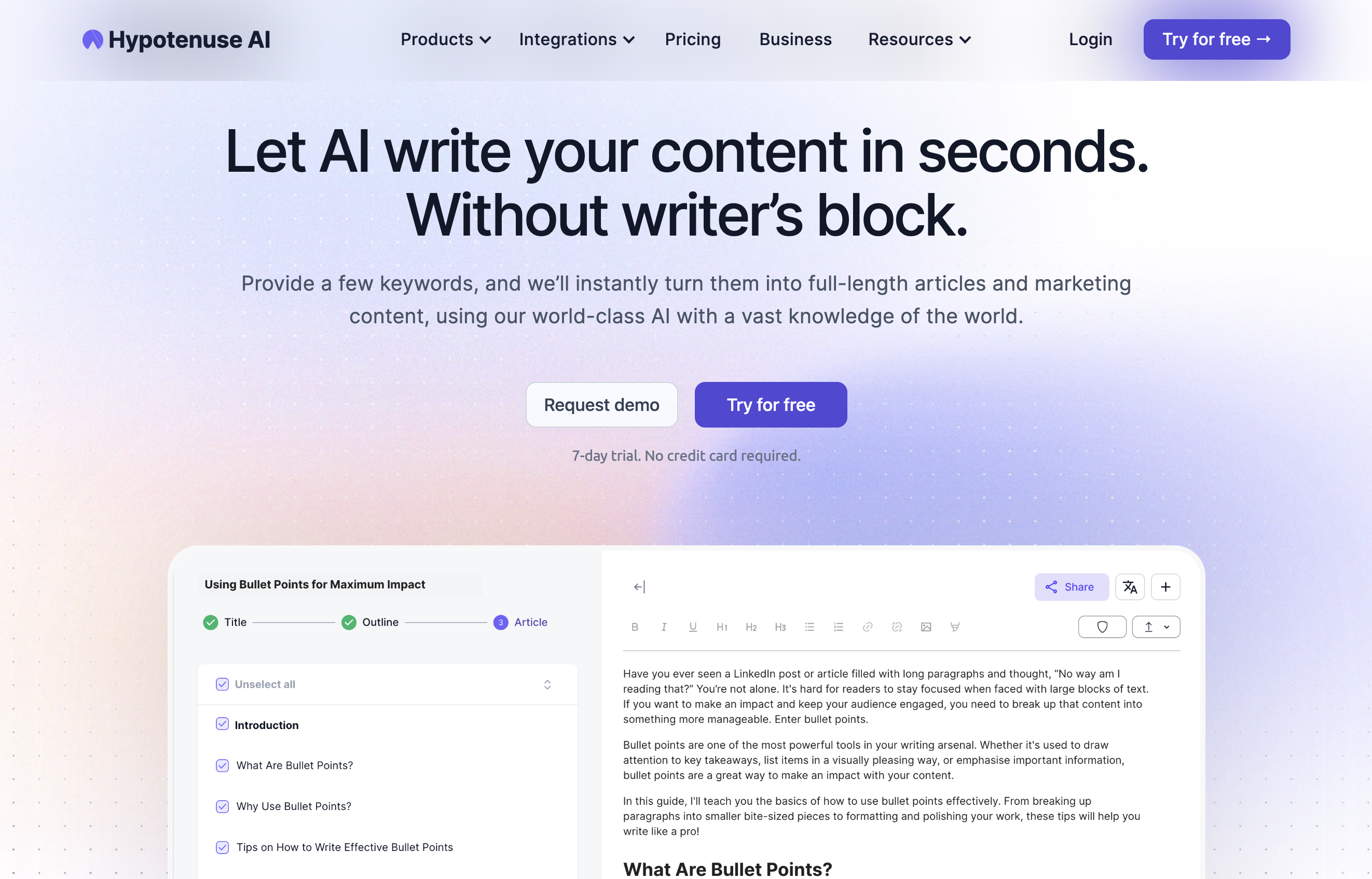 P.S. Take advantage of Hypotenuse's 7-day free trial and gain access to a suite of useful AI tools that will supercharge your content creation process. Credit card not required for sign up!