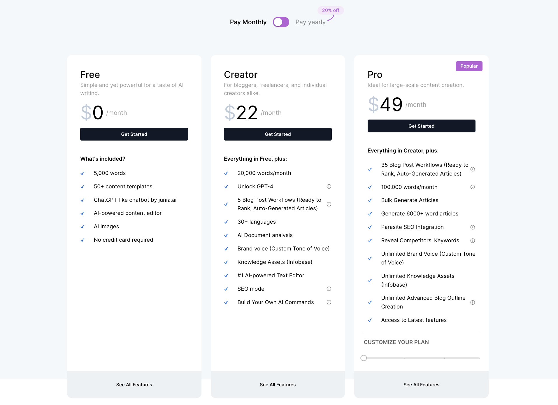 - Free Plan: Perfect for those who want to explore the features and capabilities of Junia AI.