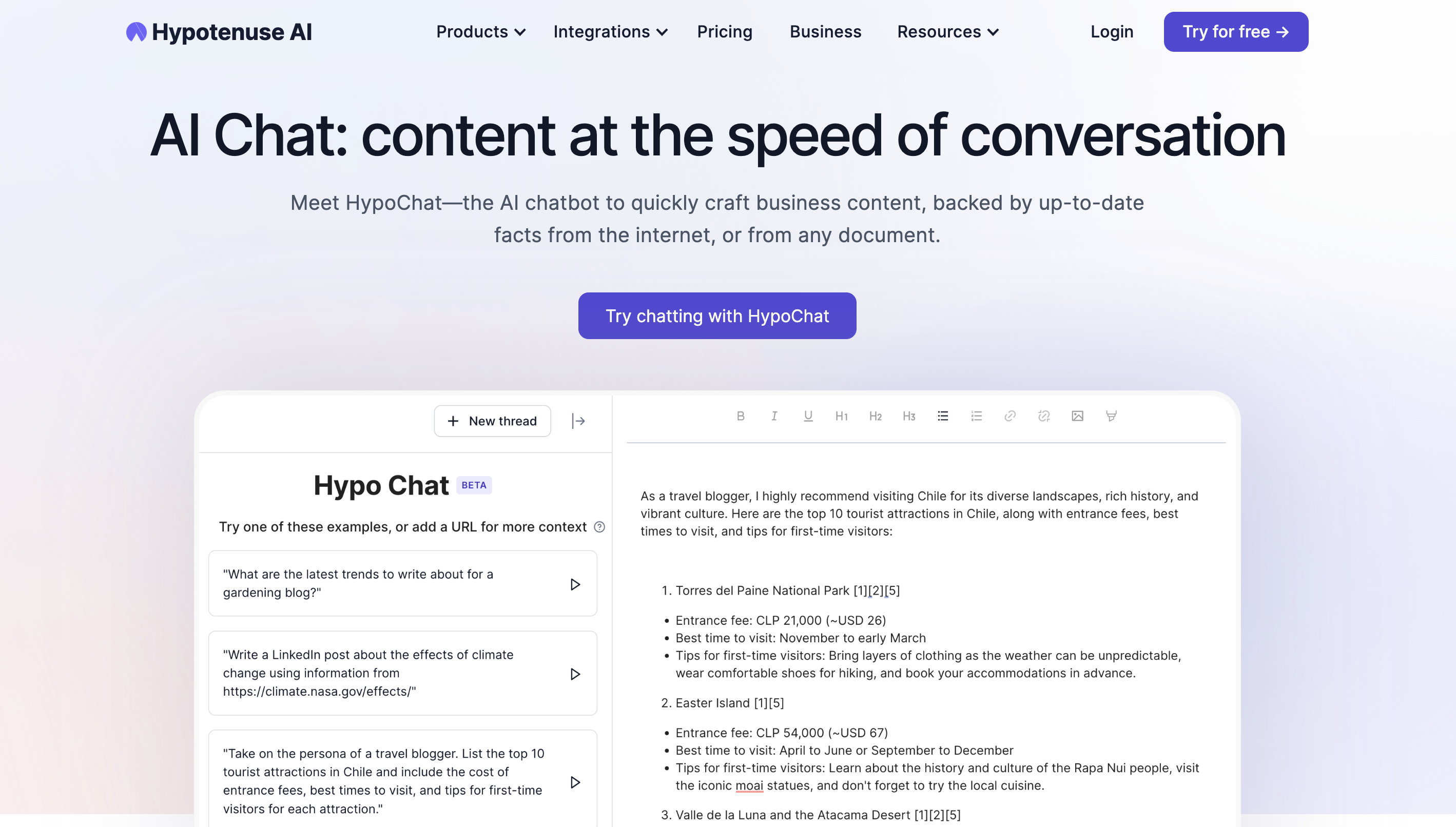 HypoChat, developed by Hypotenuse AI, is a powerful ChatGPT alternative that leverages advanced AI and natural language processing (NLP) capabilities to create high-quality content. The platform is designed to understand human language intricately, providing responses that are not only appropriate but also contextually accurate. Its memory function enables it to maintain the context throughout a conversation, ensuring that the content generated is coherent and flows smoothly. HypoChat also allows you to upload documents Whether you need help drafting professional reports, creating compelling marketing copy, or even scripting engaging dialogues, HypoChat can make the process simpler, faster, and more efficient — no matter which vertical you're in.