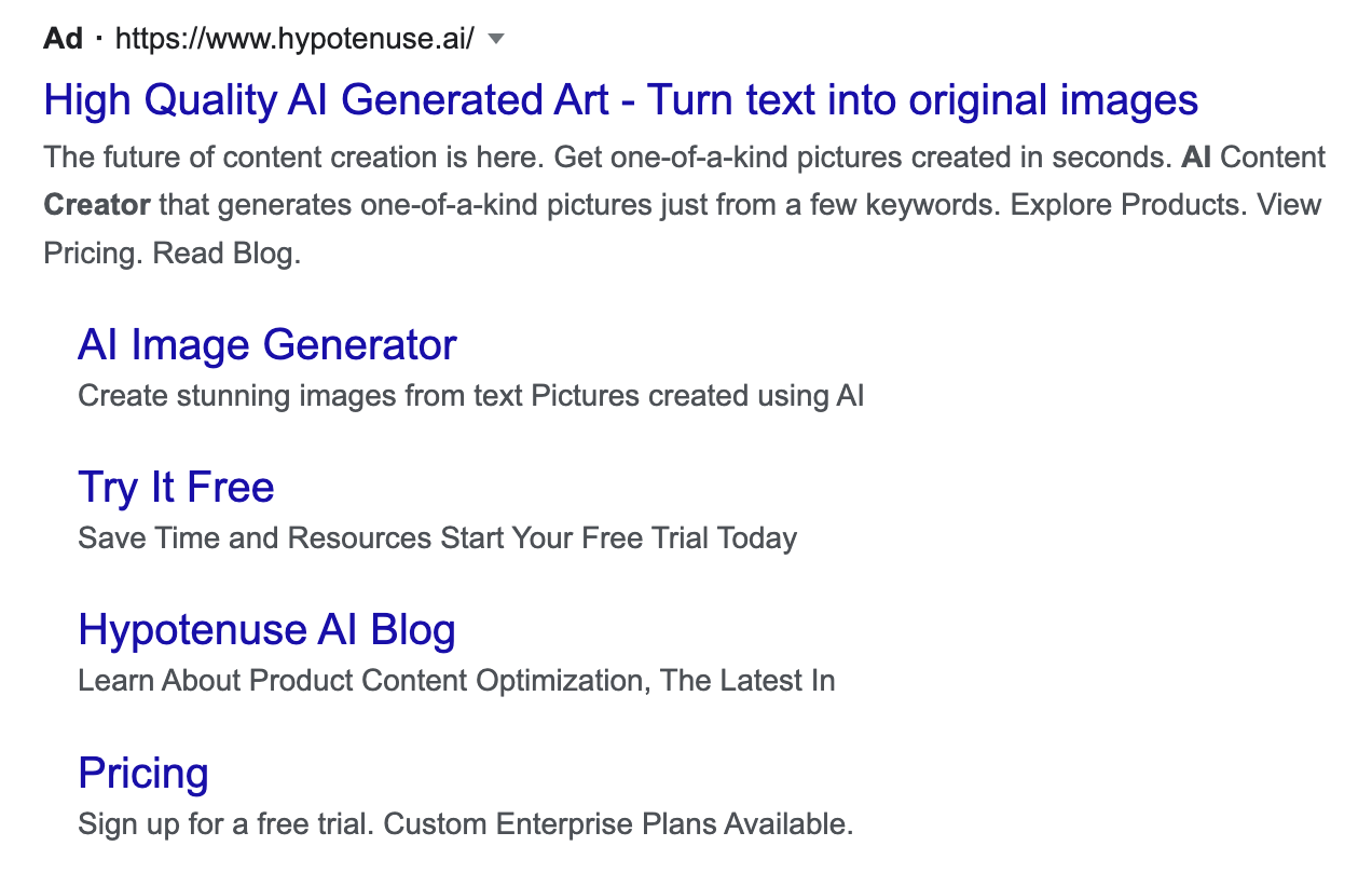If you have a well-established website, you can use site links to give your ad more real estate and encourage people to click through to specific pages. Site links are additional links that show up beneath your ad, each with their own title and destination URL.