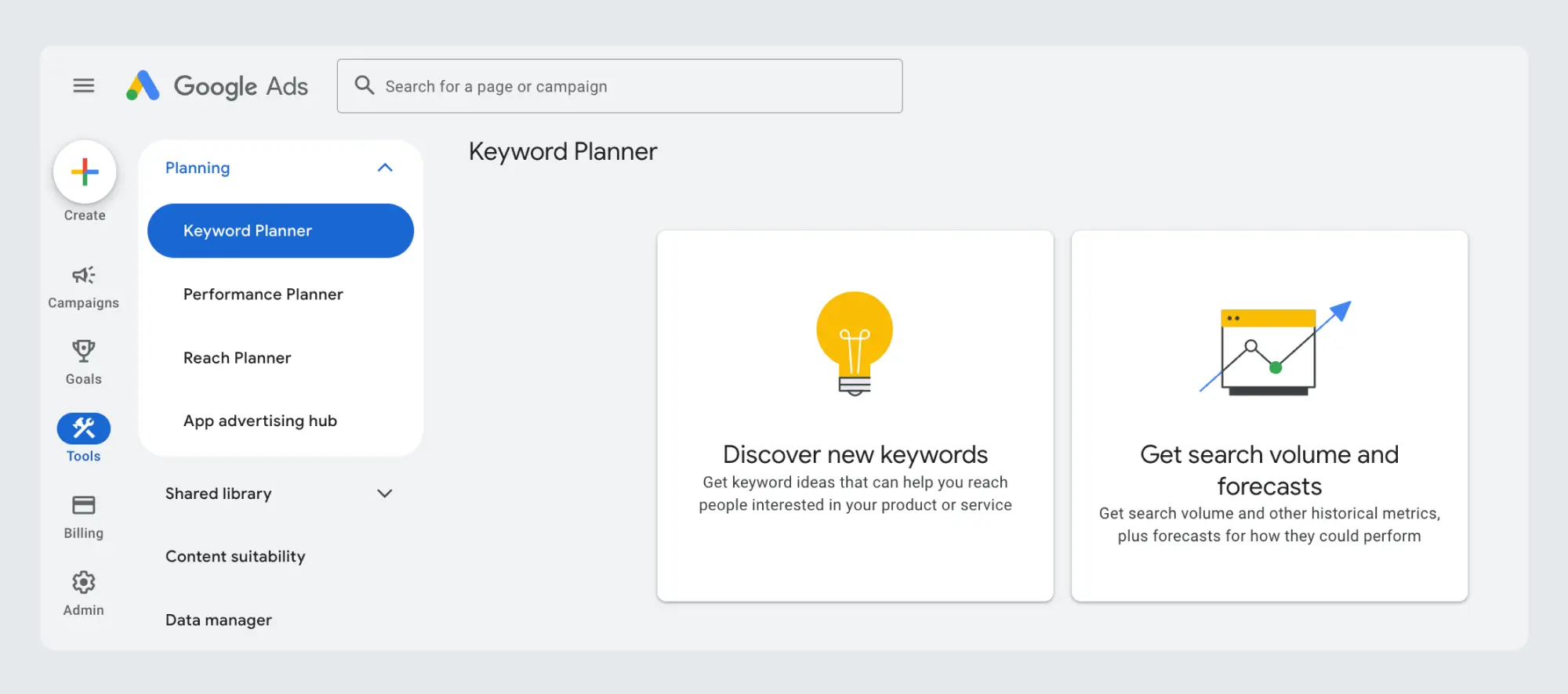 You can only access Google Keyword Planner using your Google Ads account (setup instructions here if you don’t have it yet). On the left navigation bar, go to Tools, Planning, Keyword Planner, then select Discover New Keywords.