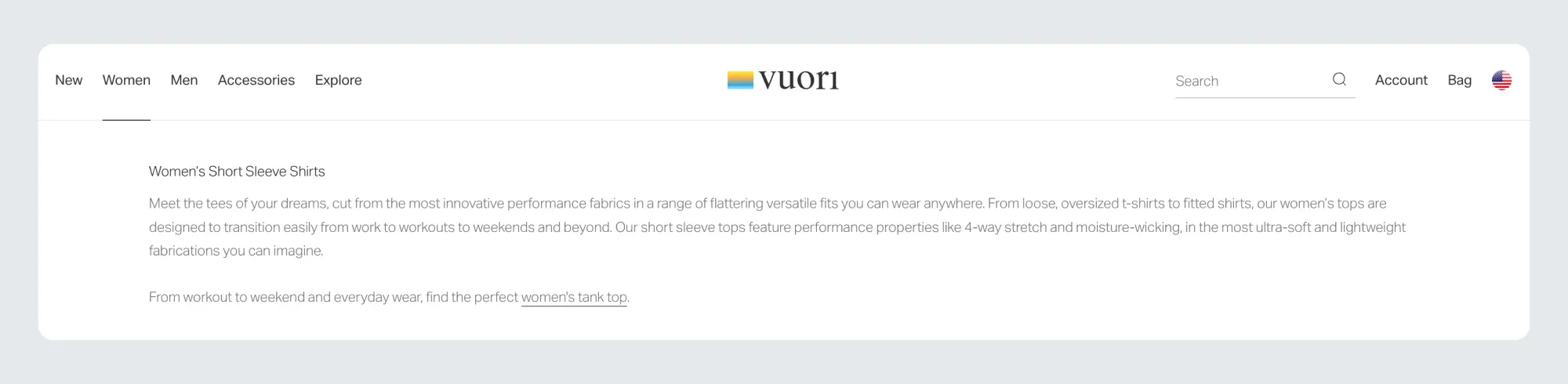 The body copy of category pages are also an opportunity for SEO. Beyond title tags and meta descriptions, search engines also look at the body copy of each page to determine its ranking.