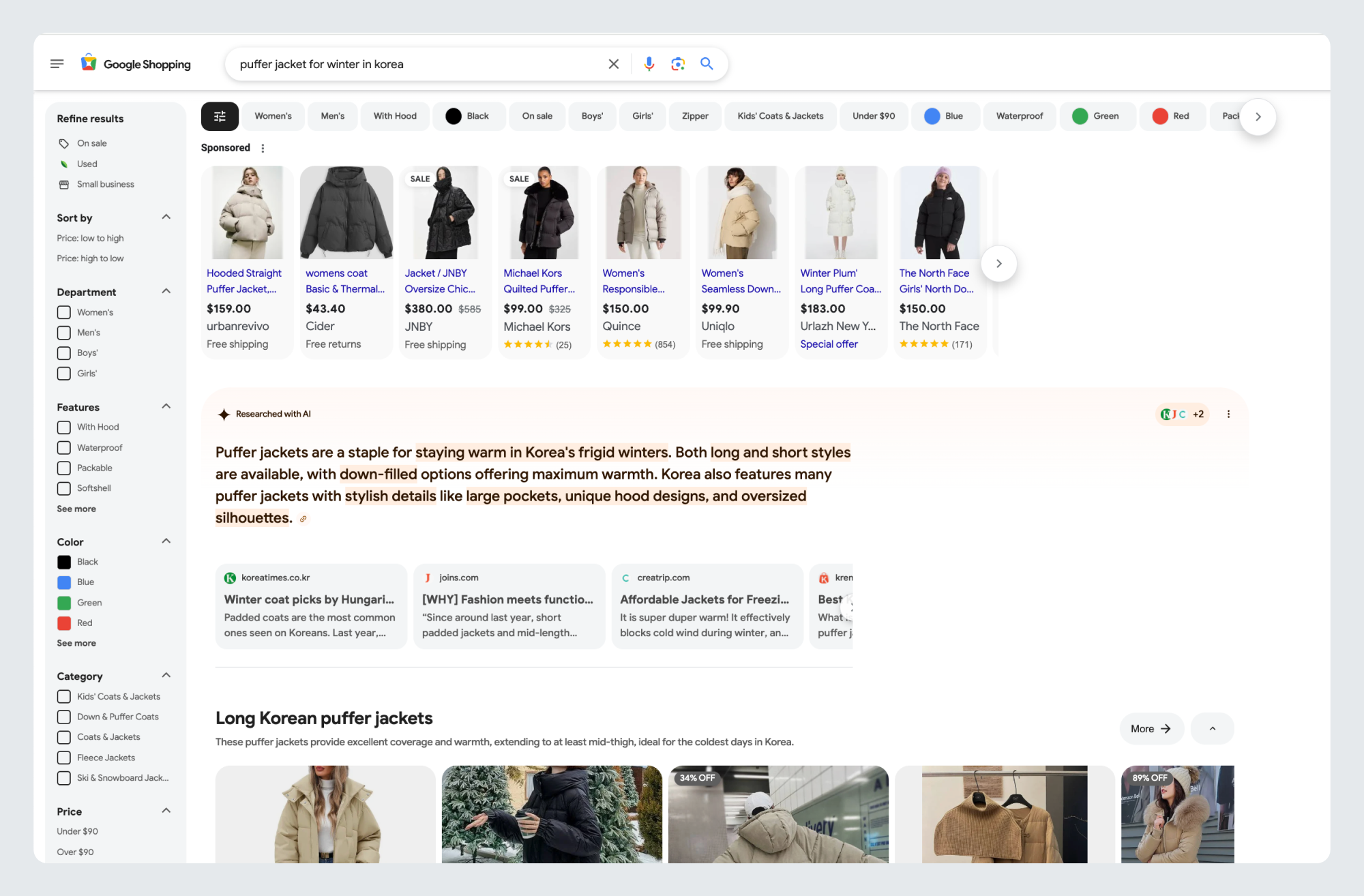 The AI-generated information don’t always appear. We found that they mostly only show up when we search for something less direct. For example, “puffer jacket for women” doesn’t deliver AI summaries, while “puffer jacket for winter” or “puffer jacket for winter in Korea” do.