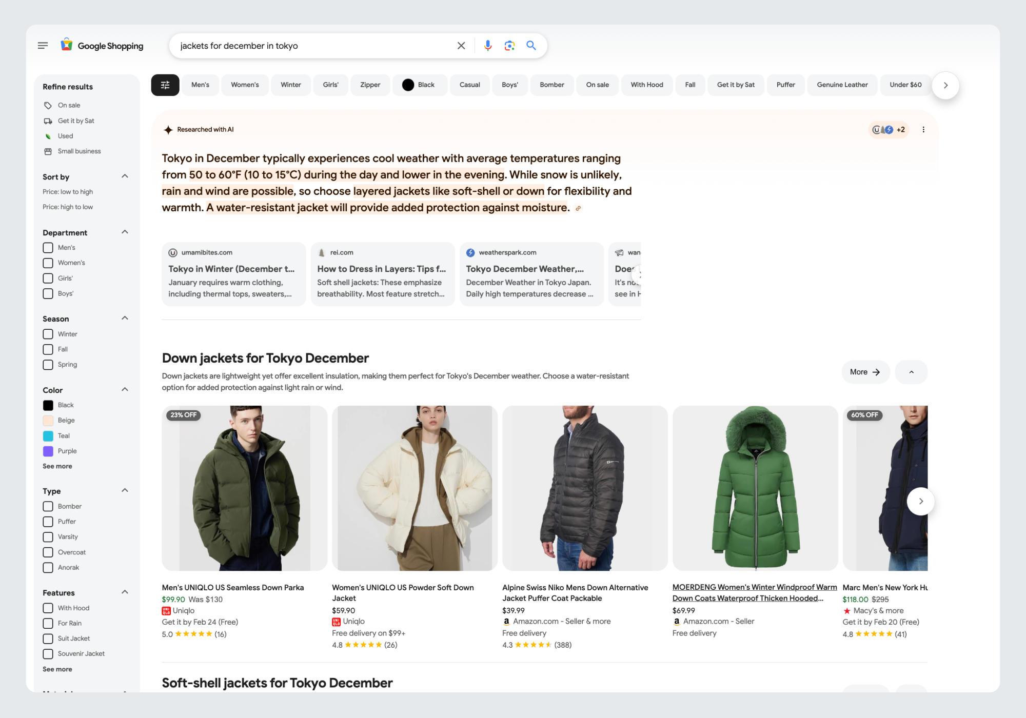 Here, we see that Google begins by researching how the temperature is like in Tokyo in December, and whether it’s windy or rains, before deciding on the type of products to recommend and sharing options that match the information it gathers.