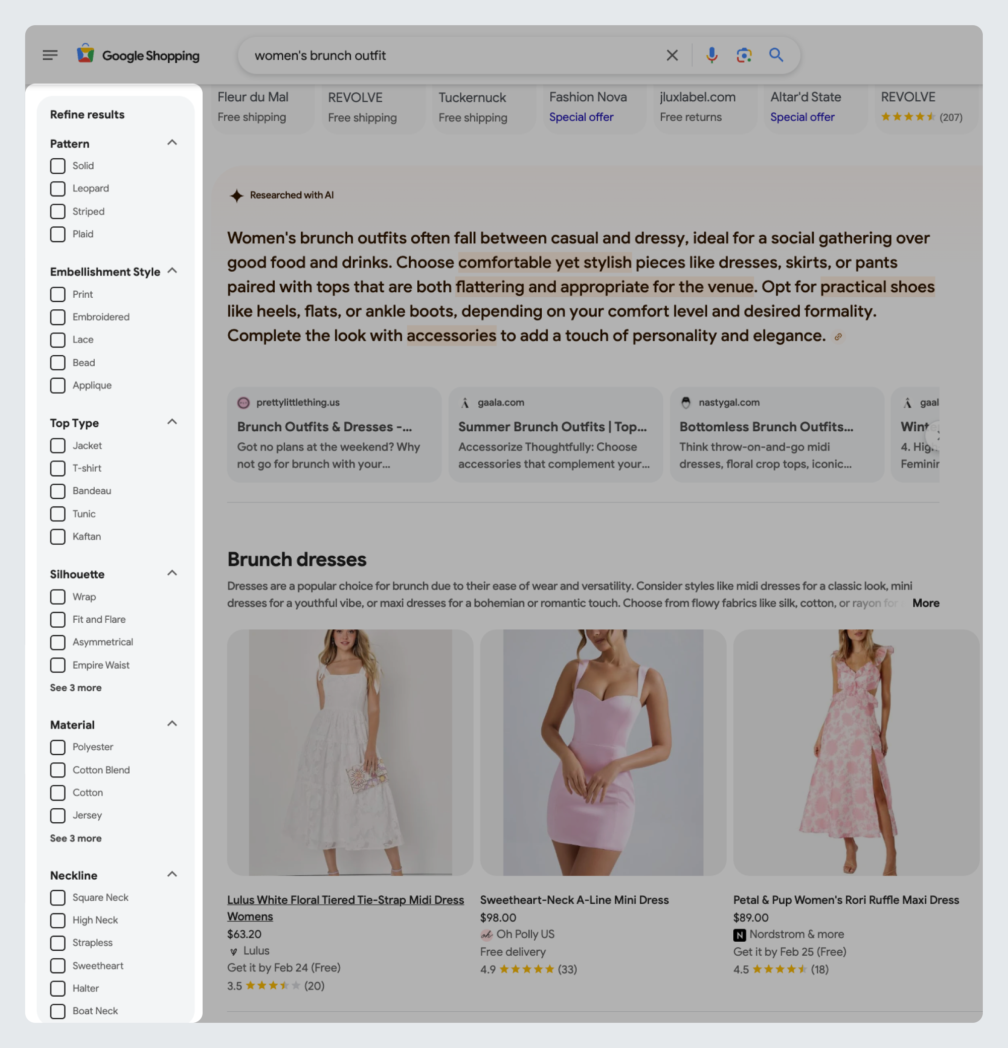 For example, under the search term “women’s brunch outfit”, you can see popular patterns like leopard, striped, or plaid, and silhouettes like wrap, fit and flare, and asymmetrical. If these are relevant, add them to your product attributes.