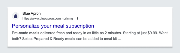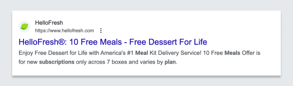 In a different result, they go by the angle of free meals and desserts. But they also filter out uneligible customers by stating that it’s for new users and including a few other disclaimers. This makes the page stand out from all other standard copy about subscriptions.