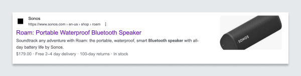 With the same keyword “portable speakers”, there’s a good mix of PLPs and PDPs. Sonos’ Roam positions itself as waterproof with an all-day battery life—both of what portable speaker shoppers would care about. They also drop hints of their brand voice with the phrase “Soundtrack any adventure…” Cool, I’d want a Sonos speaker to come with me on an adventure now.