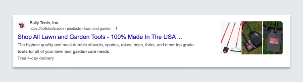Most gardening tools probably don't last. Bully Tools underlines its quality by using words like “top grade”, “durable” and “100% made in the USA”. They name their range of products, from shovels and spades to hoes and forks. They also use a simple but clear CTA.