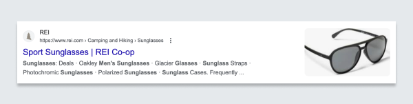 REI takes a different approach by listing its brands and product types in bullet points. This will only work if your points are highly recognizable (e.g. Oakley sunglasses or polarized sunglasses). This meta description could be improved by including USPs. Or if the range is too broad to be covered by a few selling points, REI could also state any special offers or delivery perks.