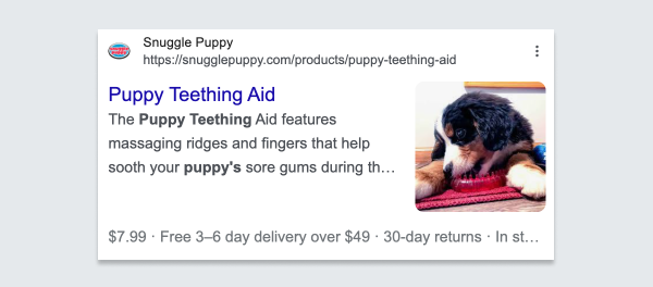 All other SERPs call their product “toys”. Snuggle Puppy differentiates itself by calling it “Puppy teething aid”. Using visually impactful words like “massaging ridges” and “sore gums” helps reassure puppy owners that they know what they’re doing.