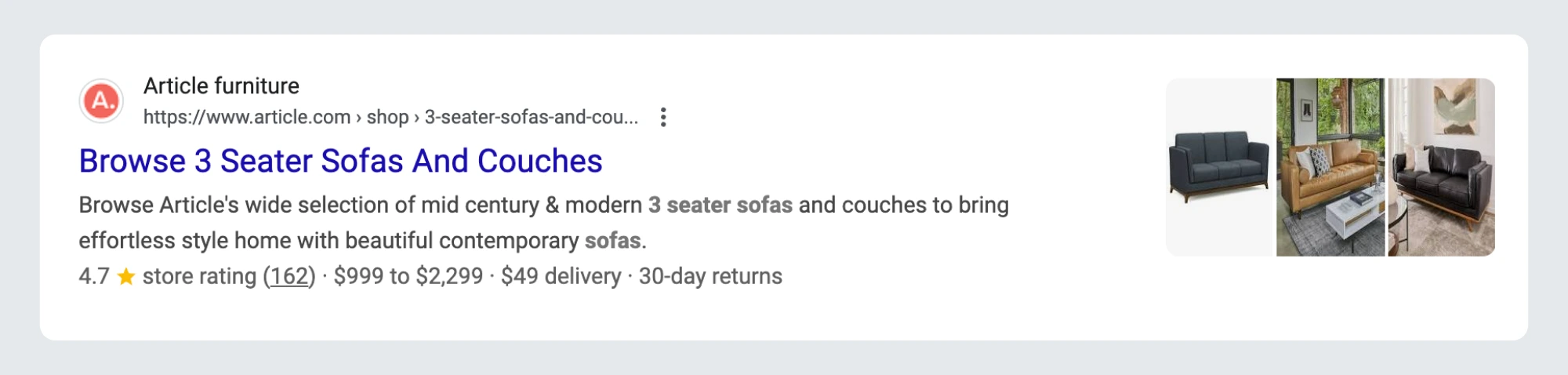 Rich snippets are enriched search results that display extra visual and informational details beyond the typical blue link. For furniture ecommerce stores, they can showcase product ratings, reviews, prices, and images. These enhancements help your listings stand out and attract more attention in competitive search results. Here’s an example.