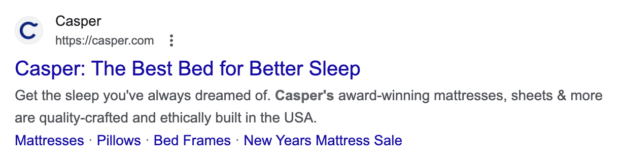 Below, the title tag—Casper: The Best Bed for Better Sleep—includes keywords like bed and sleep, and includes a strong promise of better sleep.