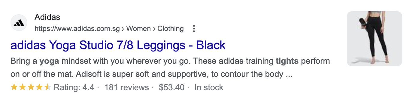 In this example, Adidas added product markup such as ratings, price and whether they have it in stock. This helps users make a more informed decision whether to click in.