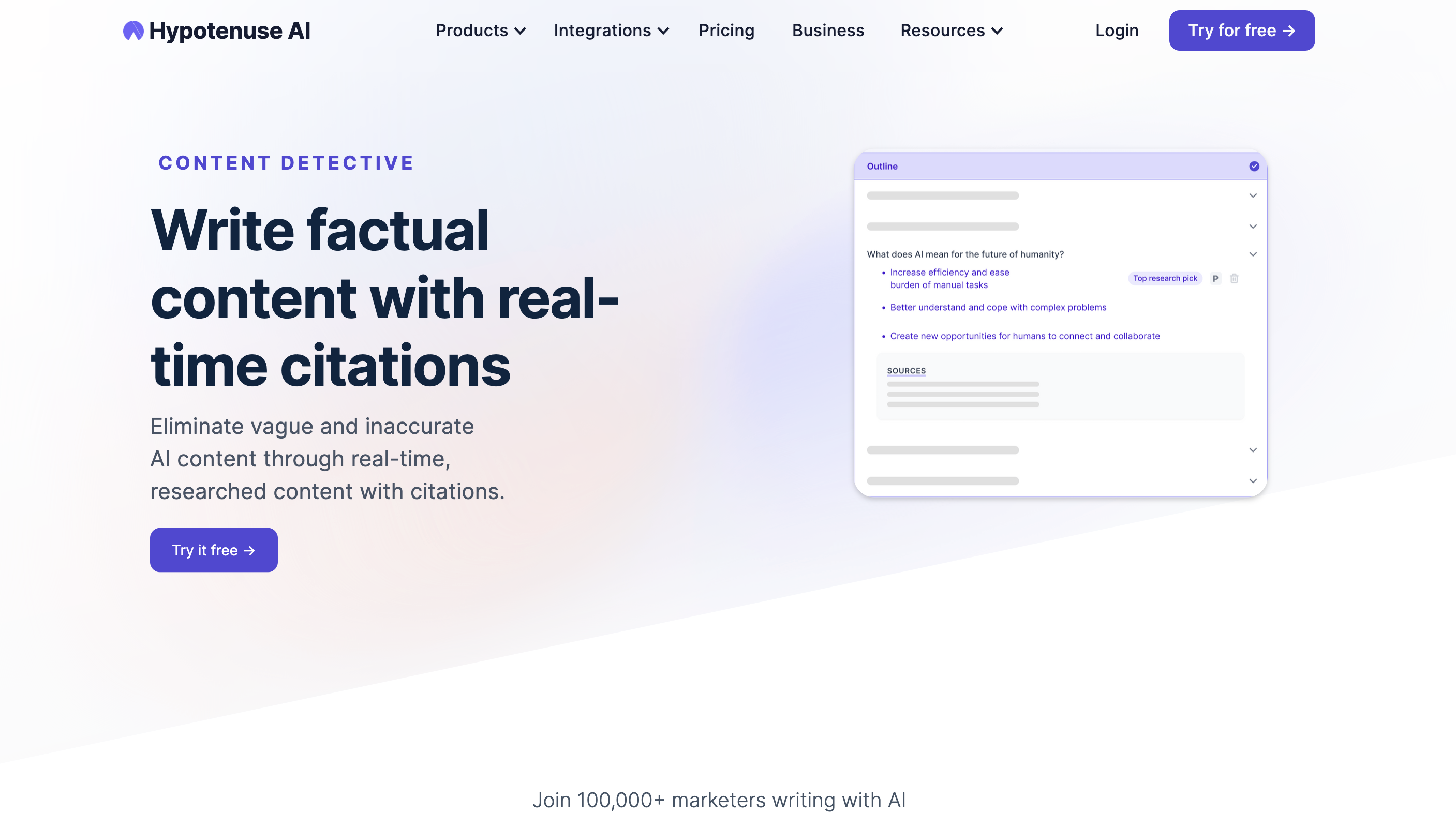 Hypotenuse AI's content detective helps you produce accurate and well-researched content. It recognizes the importance of factual accuracy and provides real-time research with proper citations to support the information it generates. AI can surface related concepts and make connections you may have missed. Consider AI a supplement to, not a replacement for, your research and brainstorming.